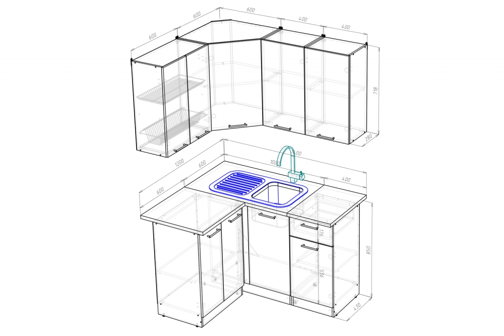 Ширина: 1200*1400 мм; Глубина: 600 мм (со столешницей)