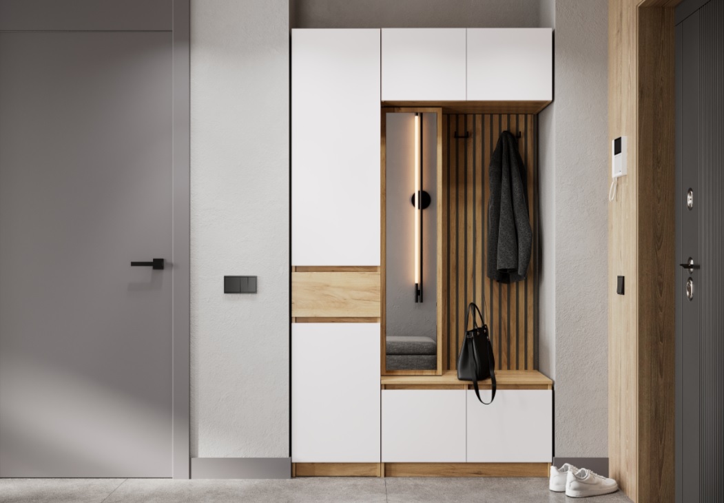 1. Щит для одежды с крючками и фотопечатью (имитация реек).