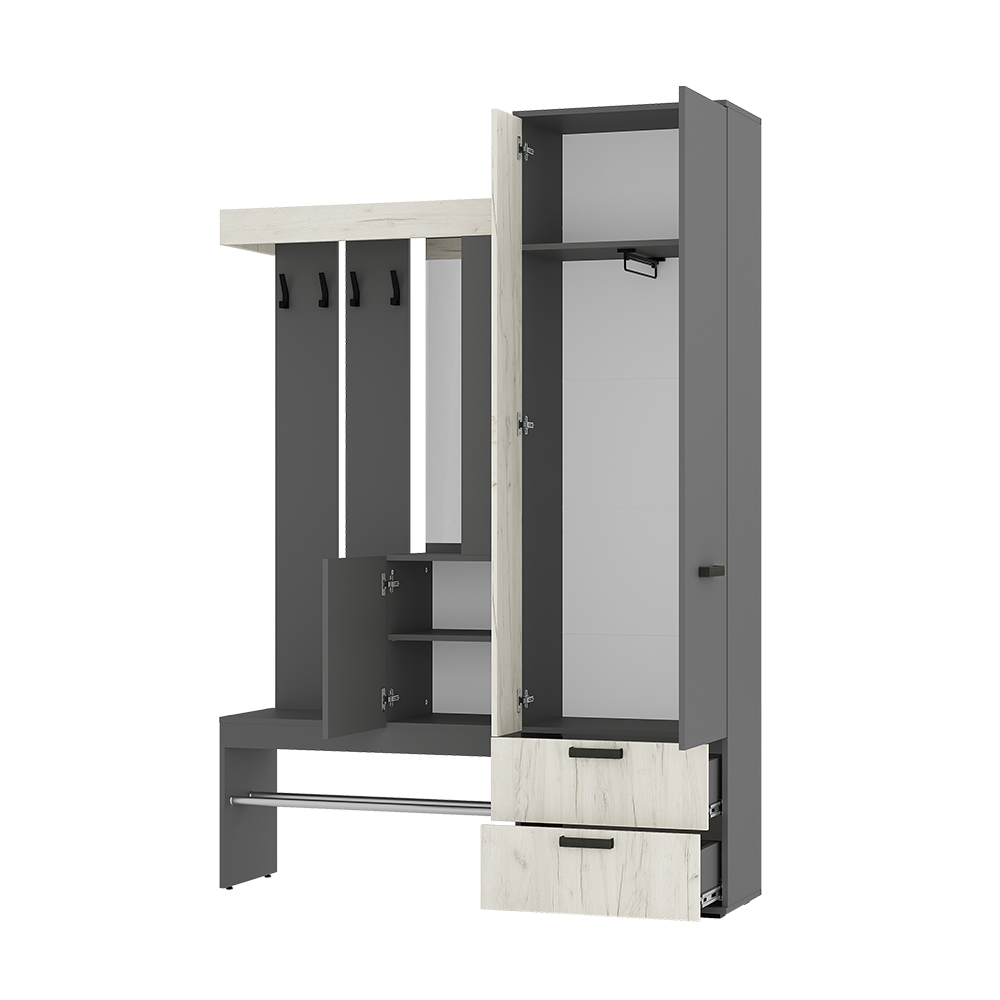 Изящная и практичная конструкция. Вместительный и компактный шкаф с отделением для верхней одежды и выдвижными ящиками. Удобная подставка под обувь (металлическая труба). Эргономичная основная секция с крючками для одежды, полками для мелочей, зеркалом и одним закрытым отделением. Контрастное исполнение в трендовых оттенках.